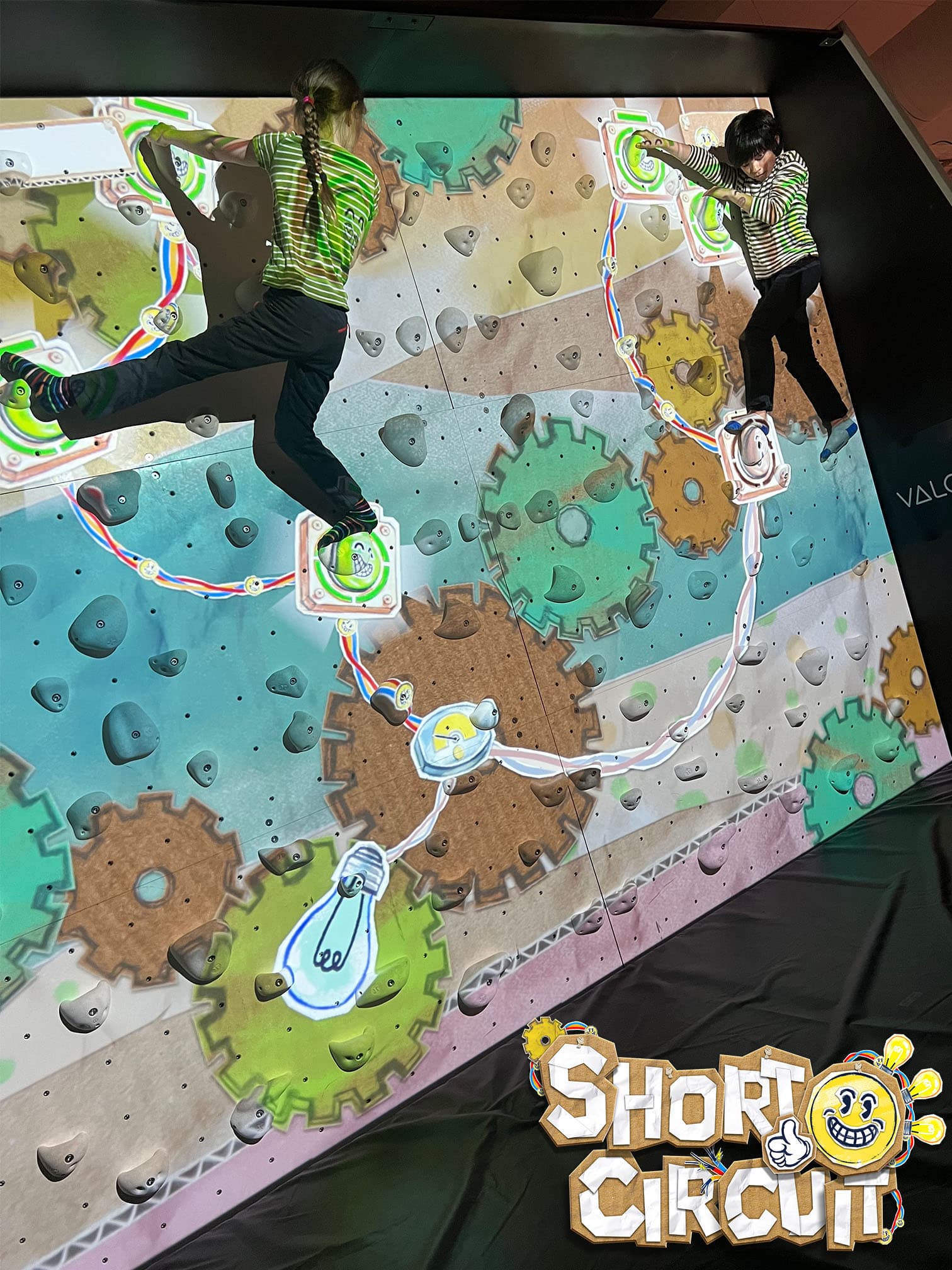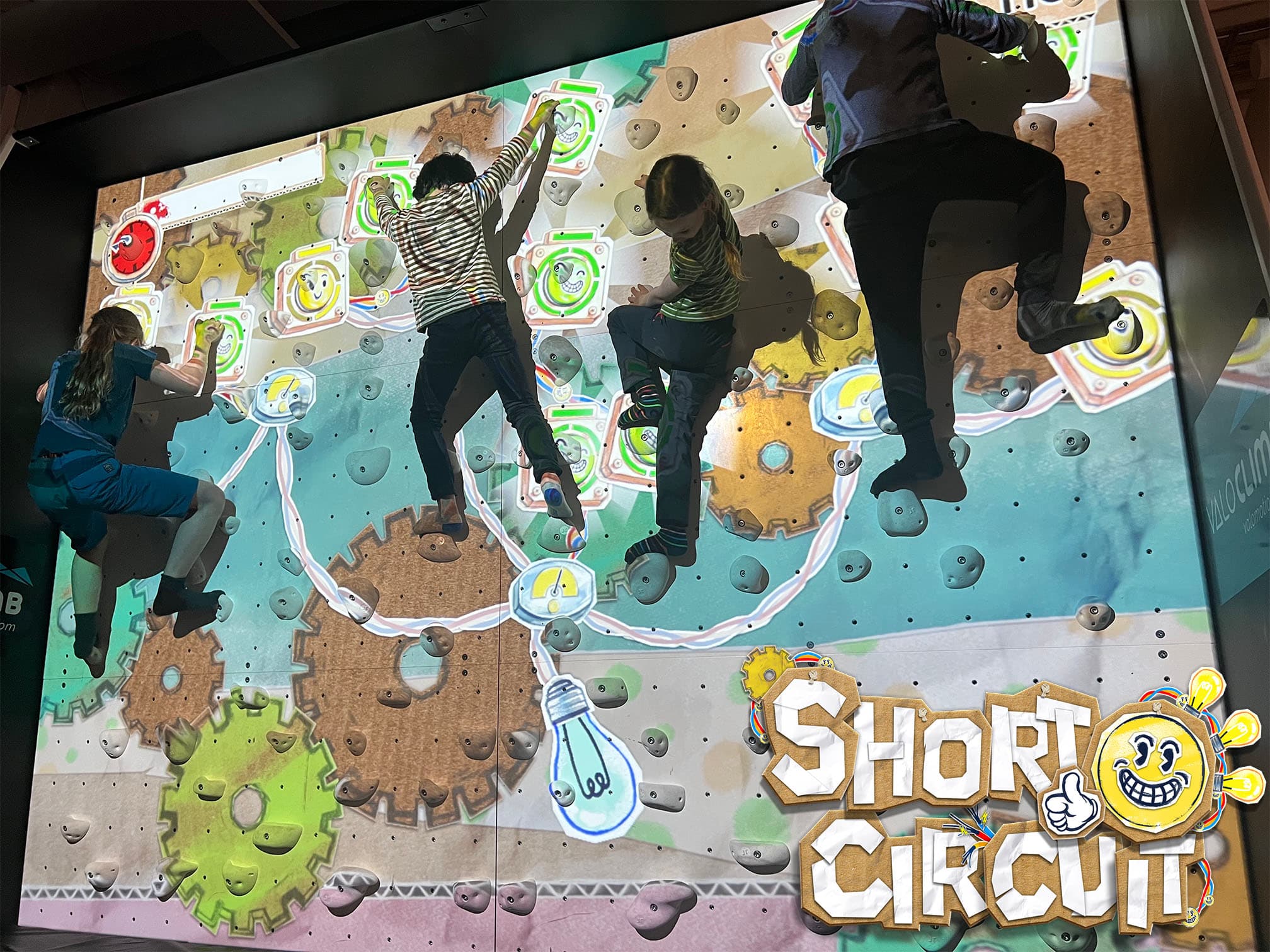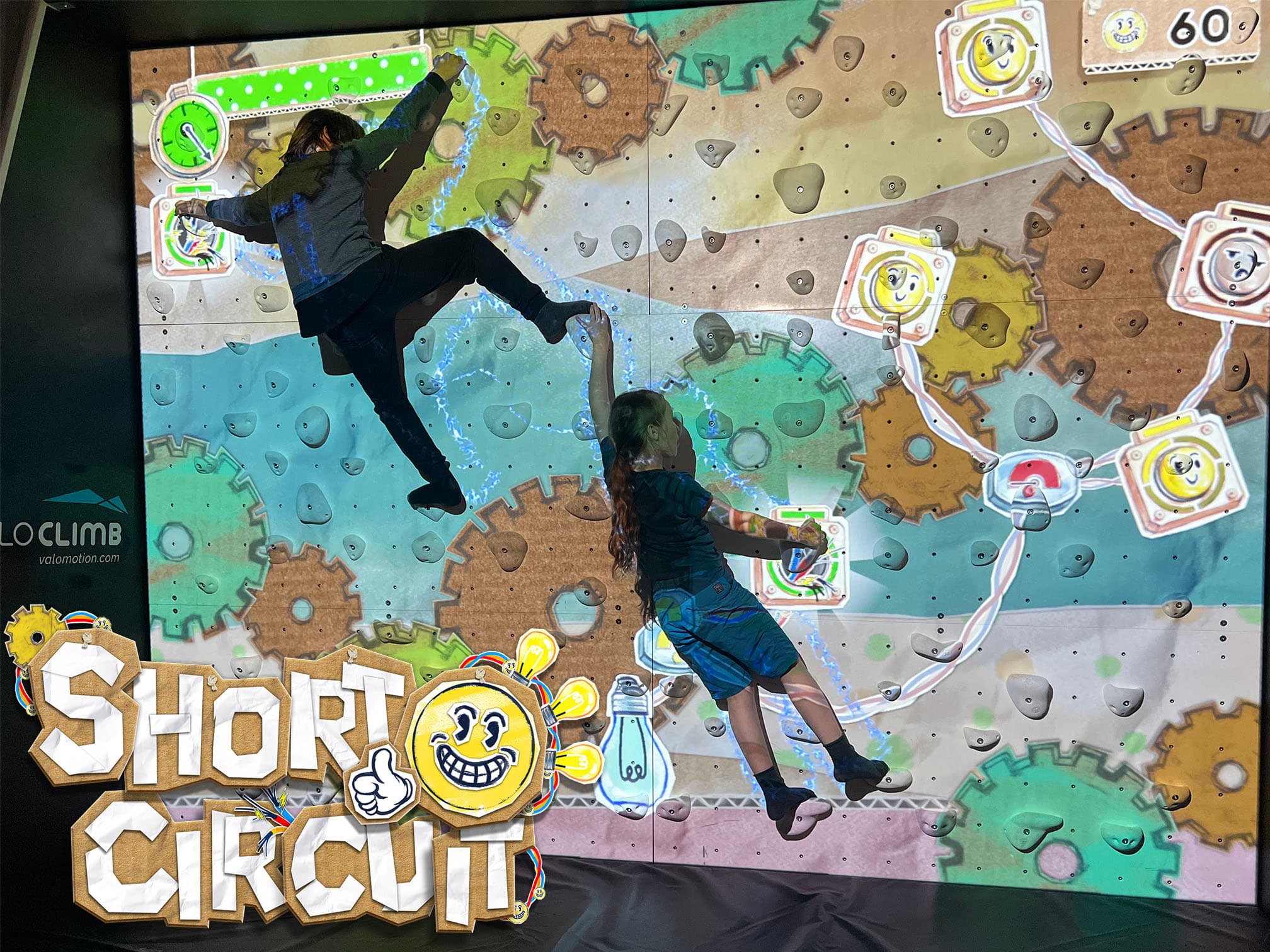 An electrifying exergame for the ValoClimb that combines bouldering with puzzle-solving and cooperation. Up to 4 players complete electrical circuits, earning points by holding difficult poses.