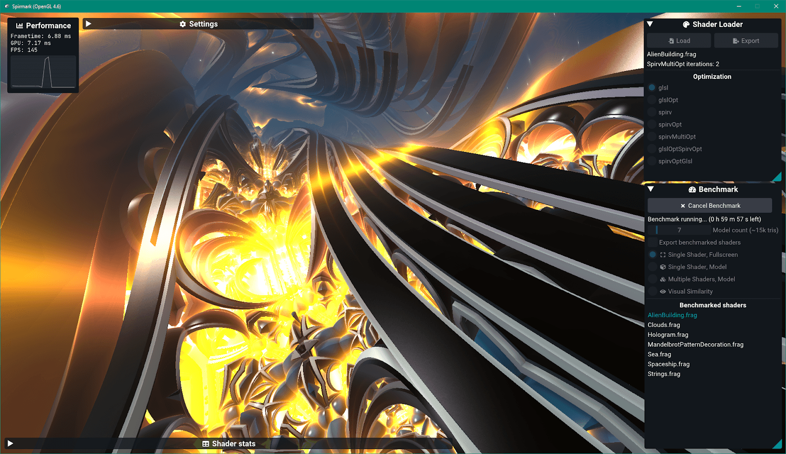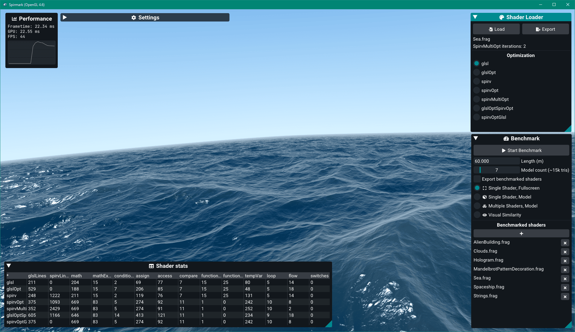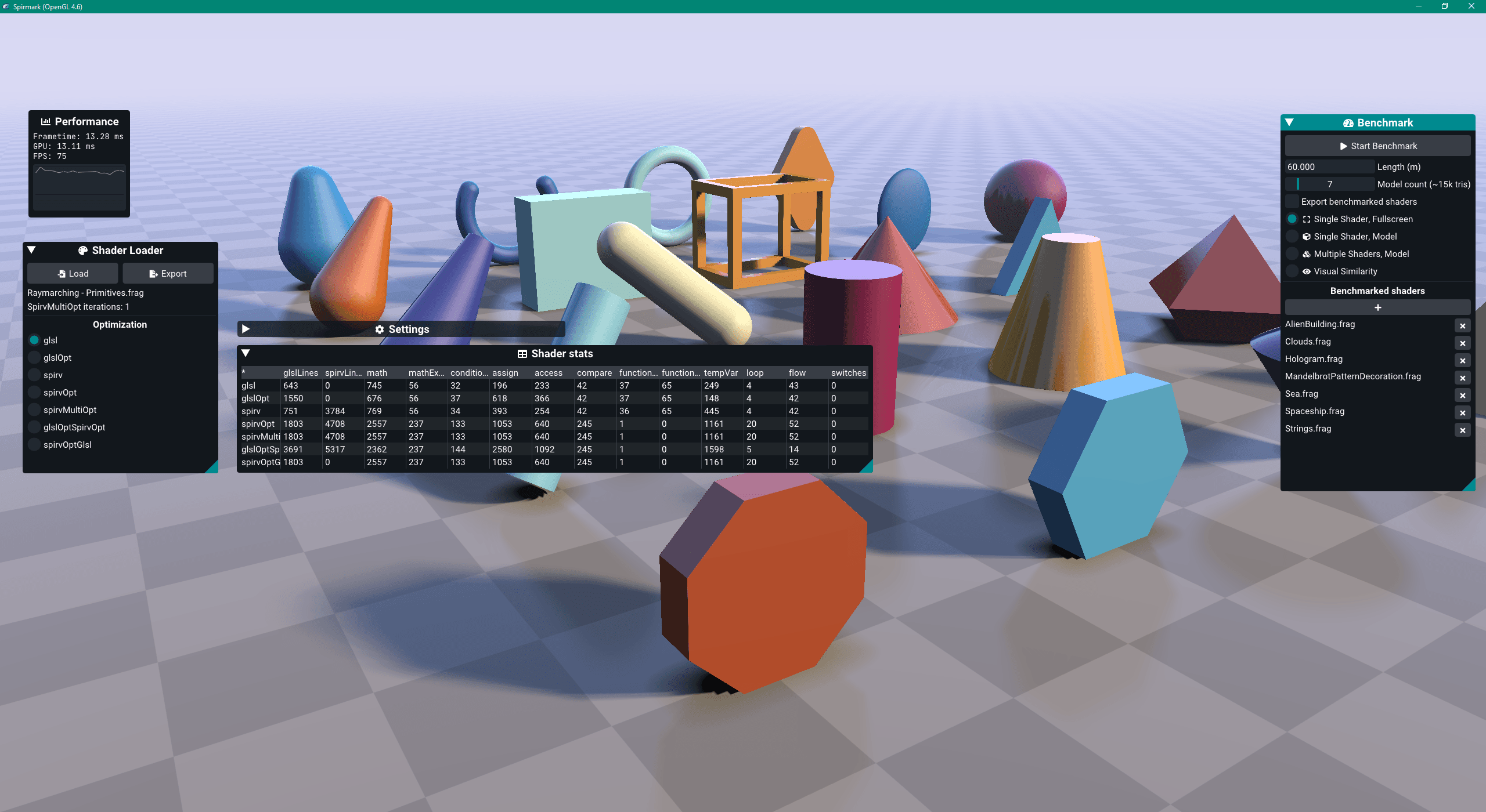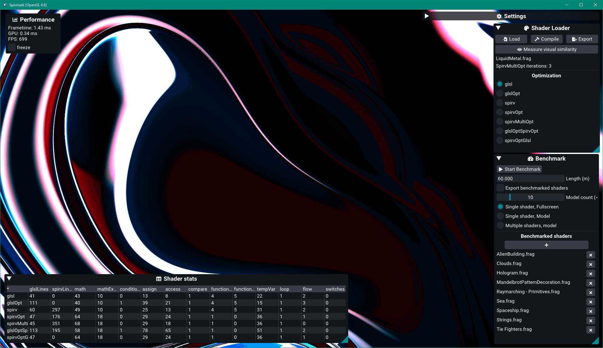 A C++ library for implementing automated shader optimizations and an application for benchmarking their effects, including performance and visual similarity.